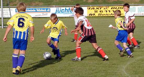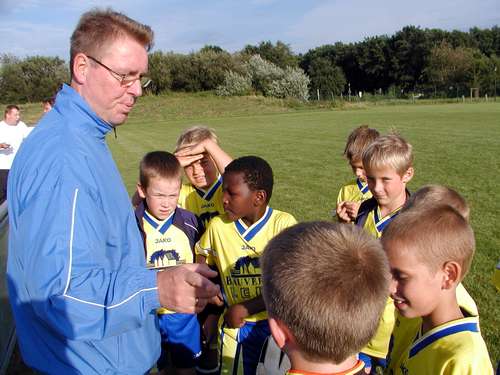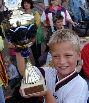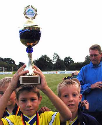 20.08.04: Stadtmeisterschaft der F-Junioren in Loga (Bauverein-Cup) ![]() Trainer Heino Müller gibt letzte Anweisungen vor dem Finale gegen Frisia Loga ![]() ![]() ![]() ![]() ![]() Nach einem 1:0-Erfolg über Germania freuten sich die Spieler von Frisia Loga über den Turniersieg... ![]() ...während der VfL-Nachwuchs immerhin den Pokal für den 2. Platz in die Höhe stemmen durfte. Fotos © Mario Rauch |