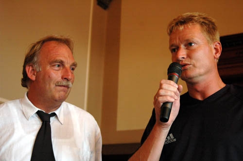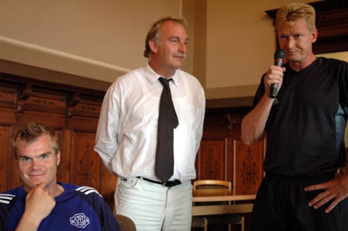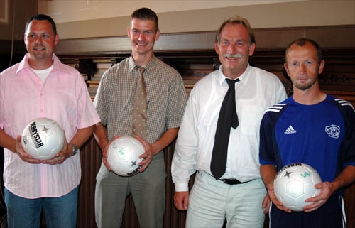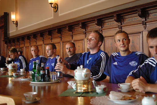 15.07.05: Meister-Ehrung beim Bürgermeister Wolfgang Kellner überreicht Wlodek Pikula einen Ball (von links): Detlef Brinkmann (Frisia Loga), Harry Harms (VfR Heisfelde), Bürgermeister Wolfgang Kellner und Wlodek Pikula (VfL Germania Leer). Wolfgang Kellner im Gespräch mit VfL-Trainer Ralf Ammermann Hille, Wolle und Ralle Mannschaft beim lecker Tee im Rathaussaal Fotos © Mario Rauch |