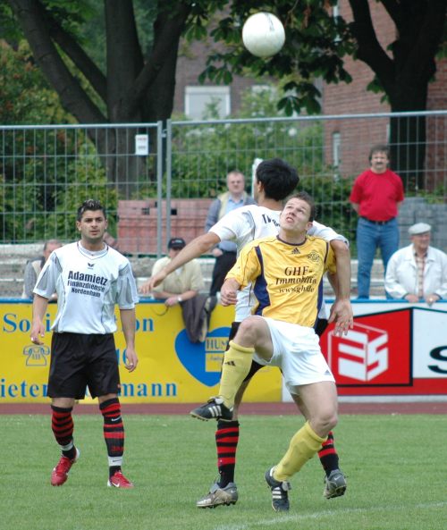 20.05.07: VfL Germania Leer - TV Esenshamm 2:0 ![]() Foto © Mario Rauch Mit sehenswerten Toren zum Titelgewinn Die Fußballer von Germania Leer machten gegen den Tabellenvorletzten Esenshamm mit einem verdienten 2:0-Sieg wie erwartet ihr Meisterstück, doch zunächst war dem Spitzenreiter der Druck deutlich anzumerken gewesen. „Wir wussten, was auf dem Spiel stand“, erklärte Kapitän Mario Rodriguez die anfängliche Nervosität. Zwei gute Chancen hatten die Gäste, ehe Germania die Partie immer besser in den Griff bekam. Mit einem sehenswerten Flugkopfball brachte Tomasz Kurpiel den VfL auf die Siegerstraße (34.), nach dem Seitenwechsel hatte der Abstiegskandidat überhaupt nichts mehr zu melden. Die gut 500 Zuschauer auf der Baustelle Hoheellernstadion sahen nun Einbahnstraßenfußball. Gästekeeper Frank Mertha, der insbesondere bei hohen Bällen nicht sicher wirkte, konnte sich über Arbeit nicht beklagen. Zunächst ließ Sherif Touré zwei Abwehrspieler aussteigen und überwand Mertha mit einem Schuss aus ganz spitzem Winkel (54.), und mit dem beruhigenden Zwei-Tore-Vorsprung versuchten die Leeraner in der Folgezeit, den Ball sozusagen über die Linie zu tragen. Bassirou Sylla köpfte aus sechs Metern an den Pfosten (62.), Erhan Colak scheiterte mit einem Heber am gut reagierenden TVE-Schlussmann (66.), Nils Grape donnerte den Ball aus acht Metern freistehend in die Wolken (74.) : und so weiter, und so weiter. In der 81. Minute brachte Trainer Johann Lünemann dann Stefan Eling für Kurpiel. Und der Rheiderländer wurde von seinen Teamgefährten mehrmals angespielt, damit er in seinem vermeintlich letzten Heimspiel für den VfL - vor der angekündigten Rückkehr nach Bunde - auch noch ein Tor erzielt. Das gelang ihm nicht, aber vielleicht spielt er ja auch nächstes Jahr an gleicher Stätte: „Er hat mir immerhin versprochen, noch einmal nachzudenken“, sagte Lünemann. „Wir möchten ihn unbedingt halten.“ (Text-Quelle: Ostfriesen-Zeitung) Der VfL: Lücking, Rodriguez, Mut, Wessels, Sylla, Harries, Duwe, Lübbers, Colak (81. Eling), Kurpiel (58. Grape), Touré (89. Busemann). Tore: 1:0 Kurpiel (34.), 2:0 Touré (55.). |